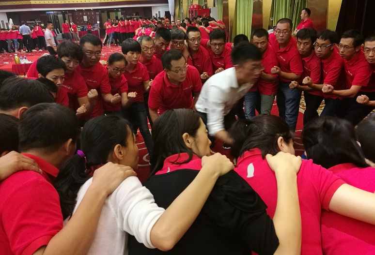 培訓(xùn)第二天用實戰(zhàn)PK的方式去對第一天所學(xué)的知識點加以印證實踐,課程中在推舉小組領(lǐng)袖的激戰(zhàn)環(huán)節(jié),經(jīng)過數(shù)輪比拼才最終成功推選出各小組領(lǐng)袖,他們將擔(dān)負著帶領(lǐng)團隊達成目標(biāo),挑戰(zhàn)記錄的使命。簡簡單單的88個數(shù)字,一遍遍,一輪輪,整整一天各個小組在沖擊吉尼斯記錄的路上不斷尋求最佳方法。而在每一輪PK中,失敗團隊的領(lǐng)袖要接受倍數(shù)遞增的懲罰,在看到小組領(lǐng)袖連續(xù)做300個俯臥撐最終幾乎癱倒在地的時候,偌大的會場鴉雀無聲,每一個人都深深的意識到,由于自己的過錯和失誤導(dǎo)致領(lǐng)袖背負著嚴(yán)重的懲罰,此時,每個人都在心中暗下決心,一定要心無雜念,全力以赴,沖擊記錄,不達目標(biāo)誓不罷休!