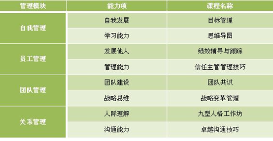 管理類(lèi)課程體系和軟性技能相關(guān),主要包括自我管理、員工管理、團(tuán)隊(duì)管理和關(guān)系管理四大模塊。