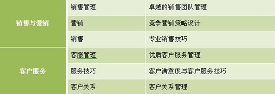 公司各個(gè)組織單元下的職能可以進(jìn)行進(jìn)一步的細(xì)分,根據(jù)細(xì)分的職能就可以確定專(zhuān)業(yè)方向上的培訓(xùn)課程體系。人力資源單元可以分為人力資源管理、招聘、員工發(fā)展、績(jī)效、薪酬、員工關(guān)系;行政單元可以分為行政管理、秘書(shū);財(cái)務(wù)單元可以分為財(cái)務(wù)管理、會(huì)計(jì)、審計(jì);物流與供應(yīng)單元可以分為采購(gòu)、物流、倉(cāng)儲(chǔ);生產(chǎn)與質(zhì)量管理單元可以分為生產(chǎn)管理、現(xiàn)場(chǎng)管理、流程管理、質(zhì)量管理、過(guò)程管理;銷(xiāo)售與營(yíng)銷(xiāo)單元可以分為銷(xiāo)售團(tuán)隊(duì)管理、營(yíng)銷(xiāo)、銷(xiāo)售、市場(chǎng);客戶(hù)服務(wù)單元可以分為客服管理系統(tǒng)、客戶(hù)服務(wù)、客戶(hù)關(guān)系。以下為專(zhuān)業(yè)類(lèi)課程體系部分部分內(nèi)容: