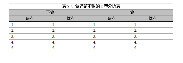 此時(shí),如果你習(xí)慣性地拿出一支筆、一張白紙,隨手畫(huà)一個(gè)T型分析表(見(jiàn)表2-2),也許就能幫你快速理清思路,做出你真正想要的那個(gè)正確的選擇。