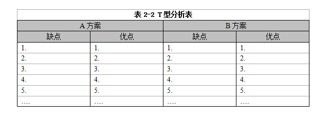 T型分析表中的“缺點(diǎn)、優(yōu)點(diǎn)、好處、壞處”等欄中應(yīng)盡可能多地列出相應(yīng)的答案,確保你對(duì)該問(wèn)題的思考能保持足夠的深度與廣度。