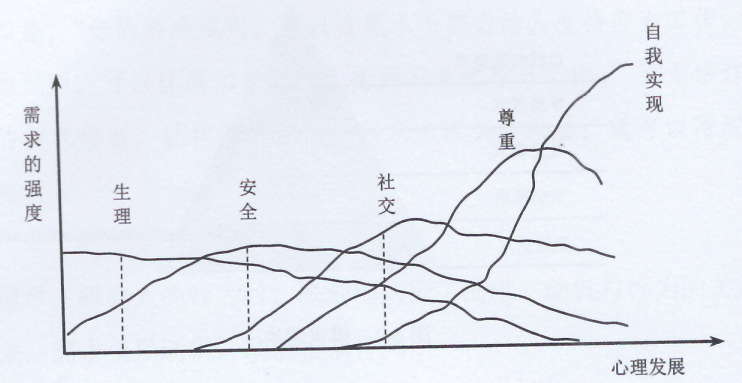 核心觀點(diǎn)四:五個(gè)層次的需求常常同時(shí)存在,只是需求的強(qiáng)度呈現(xiàn)如圖4-3所示的拋物線狀分布。